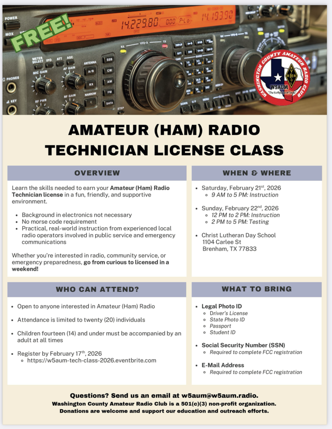[W5SFA] Fwd: [BARC] Free Upcoming Tech License Class from W5AUM