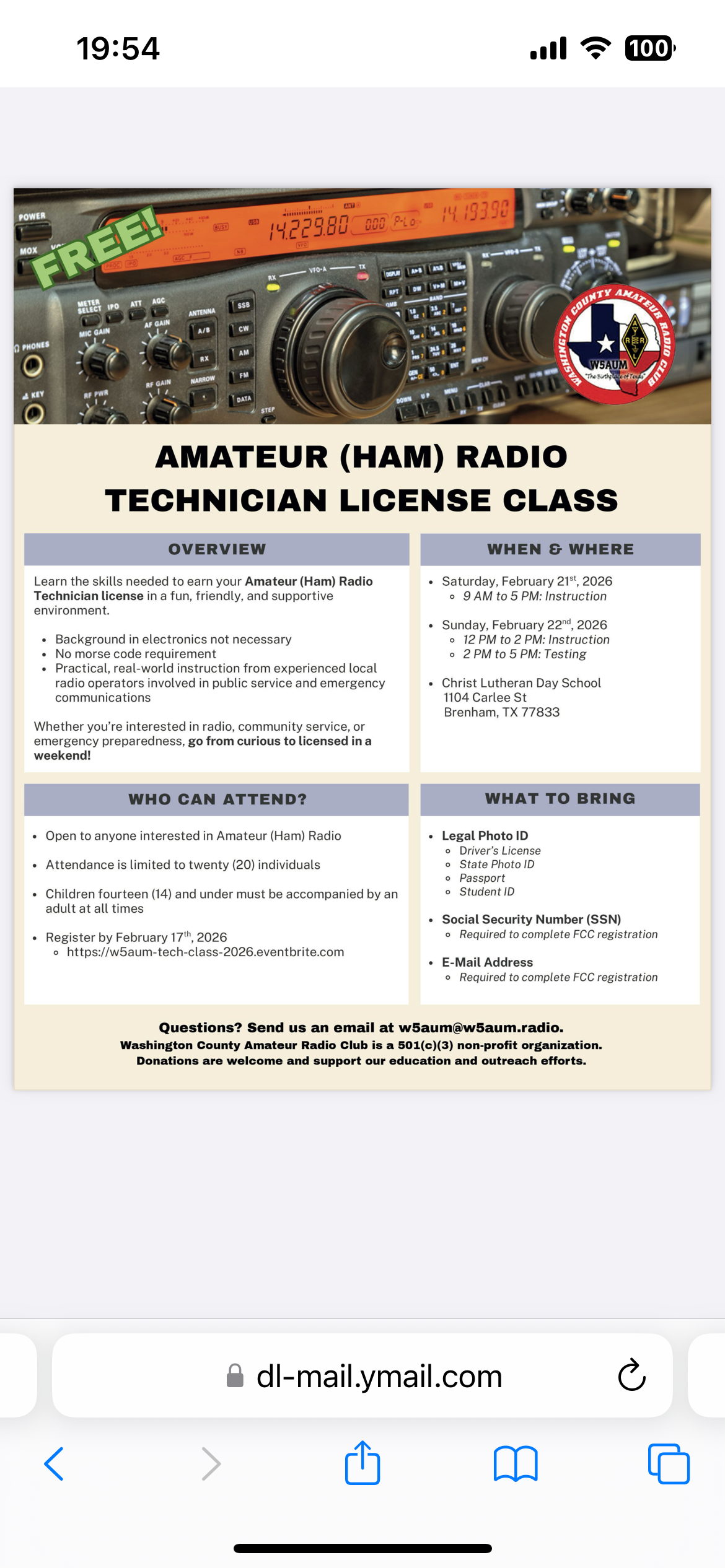 Please see the attachment for information regarding the upcoming FREE technician ham license class from the Washington County Amateur Radio Club.